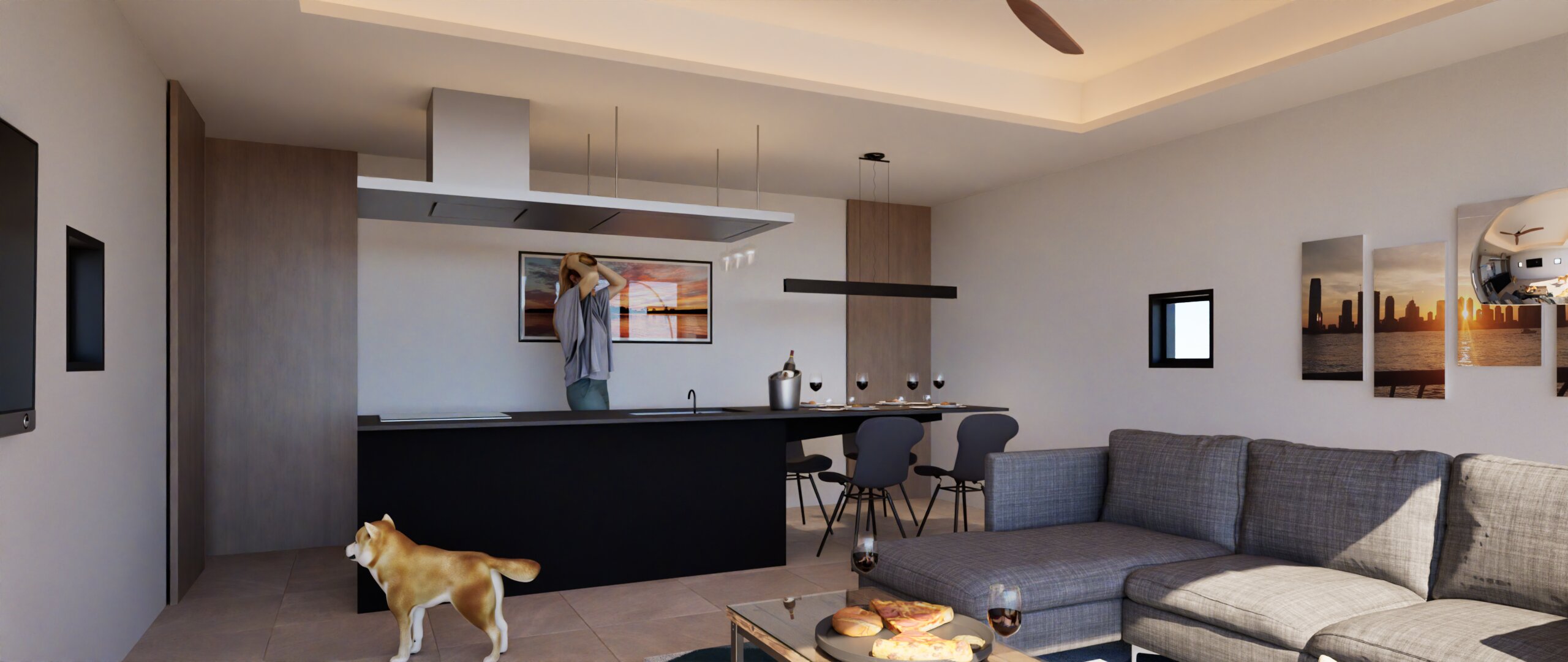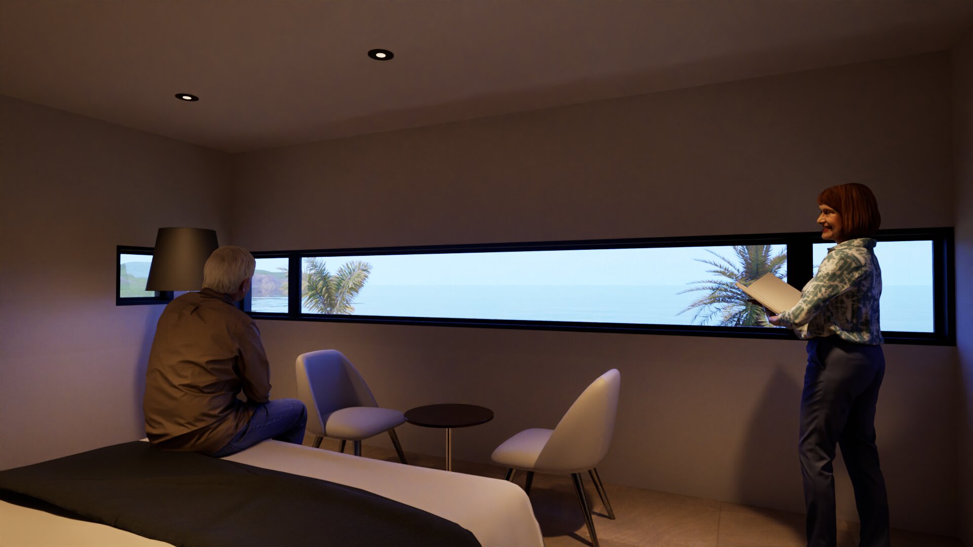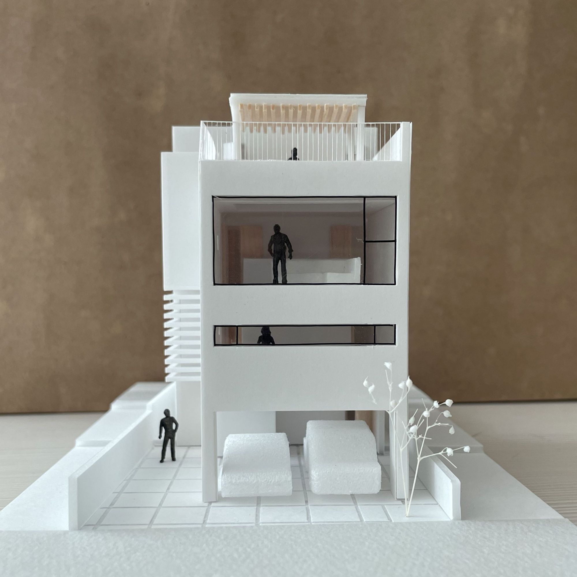 敷地の道路向かいは西海岸の海が広がり、各部屋から海と空が一体感と望めるよう大きな開口を取り入れた。室内の仕上げでは、琉球石灰岩や木格子など沖縄の要素を現代的に洗練させたデザインとし、シンプルでミニマルなインテリアに、沖縄の伝統的な工芸品であるやちむんや染物がアートされる予定である。